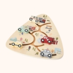 Zabawka przedstawia różne pojazdy, takie jak samochód policyjny, straż pożarna, taxi czy śmieciarka, co dodatkowo zachęca dziecko do poznawania otaczającego świata oraz rozwijania wyobraźni poprzez tworzenie własnych scenariuszy zabawy.