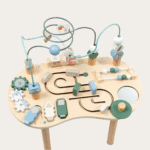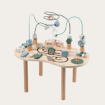 Ten uroczy, drewniany stolik to idealny towarzysz codziennej zabawy i nauki dla maluchów. Na stabilnej podstawie znajdują się kolorowe druty z koralikami, po których dziecko może przesuwać małe kuleczki, rozwijając przy tym zdolności manualne, koordynację i cierpliwość.