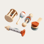 Ten uroczy zestaw to mała orkiestra w dziecięcych rączkach! Składa się z pięciu drewnianych instrumentów – grzechotek, dzwonków i małych bębenków – które wydają przyjemne dźwięki, zachęcając malucha do eksperymentowania z rytmem i muzyką.